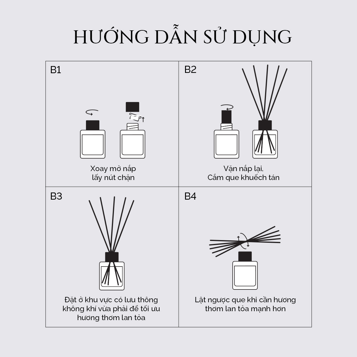 Cắm que vào lọ tinh dầu và chờ khoảng 30 phút – 1 giờ để que hút tinh dầu lên và phát tán hương thơm tự nhiên. Đảo ngược đầu que sau 30 phút để hỗ trợ phát tán nhanh hơn.